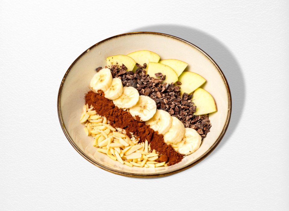 Yulaf, yulaf südü, banan, alma, kakao tozu, kakao qırıntıları, badam lopaları, darçın