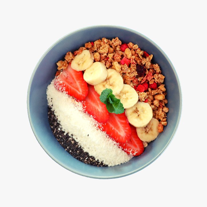 Asai, banan, çiyələk, kokos qırıntıları, badam lopaları, çia toxumları
