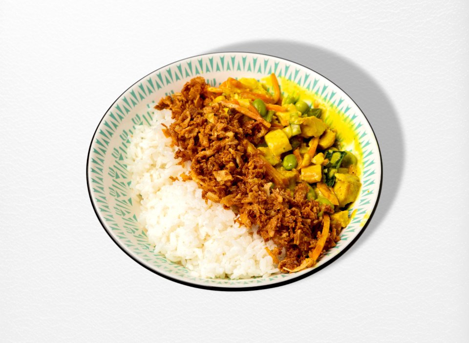 Suşi düyüsü, toyuq, kokos südü, Asiya sayağıtərəvəzlər, qızardılmış soğan