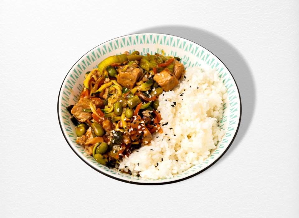 Suşi düyüsü, qizardılmış qızılbalıq, teriyaki küncüt sousu, Asiya sayağı tərəvəzlər, küncüt